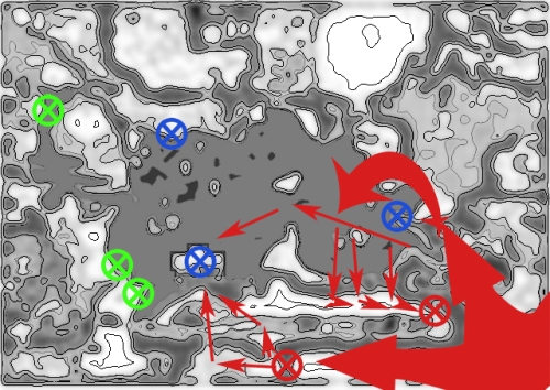 但是诺亚军的第二波攻势猛烈得超乎想象,在对以斯拉港攻击的同时也分兵南下,在内海南部的滩头大量登陆,直扑沙漠中的北关口和死亡十字,同时大量的部队也开始进攻南部沙漠中的南关口,企图两面夹击,消灭雨谷中的工业据点梅尔特镇。